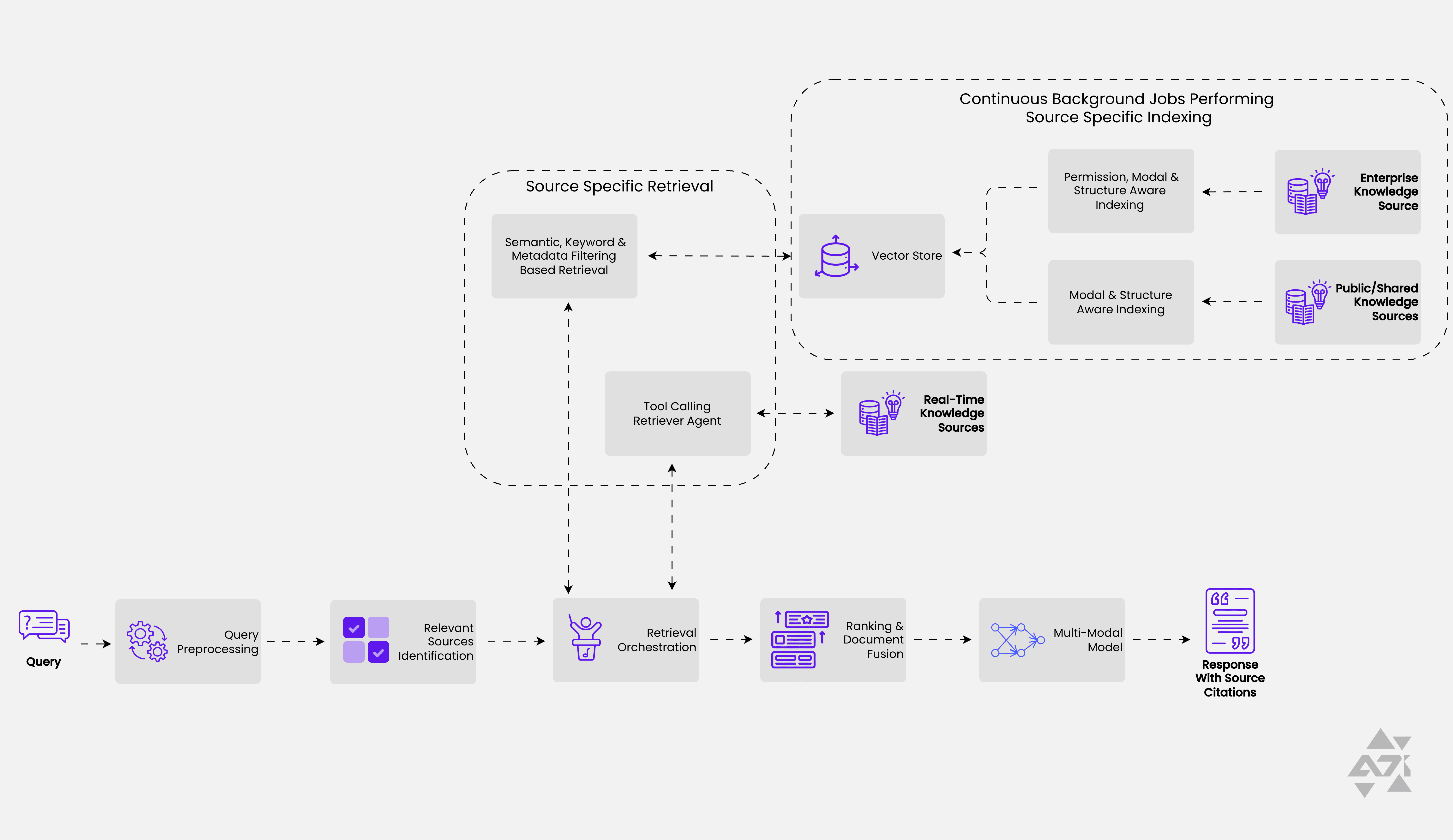 Each knowledge source may have its own ingestion and indexing strategy, requiring a robust orchestration layer to manage retrieval, augmentation, and context fusion before passing data to an LLM. This pattern is especially valuable in enterprise environments where information is fragmented across multiple structured and unstructured data sources.