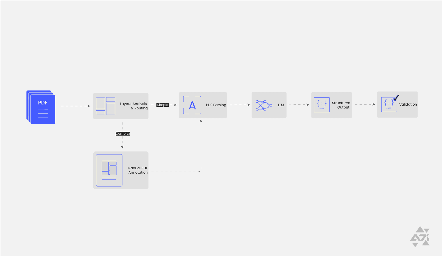 This pattern ensures business reliability by balancing AI efficiency with human oversight, making it particularly valuable in domains where accurate data extraction is critical but layouts remain unpredictable. It works best when complex PDFs account for less than 5-10% of the total volume, ensuring scalable automation while keeping edge cases under control.